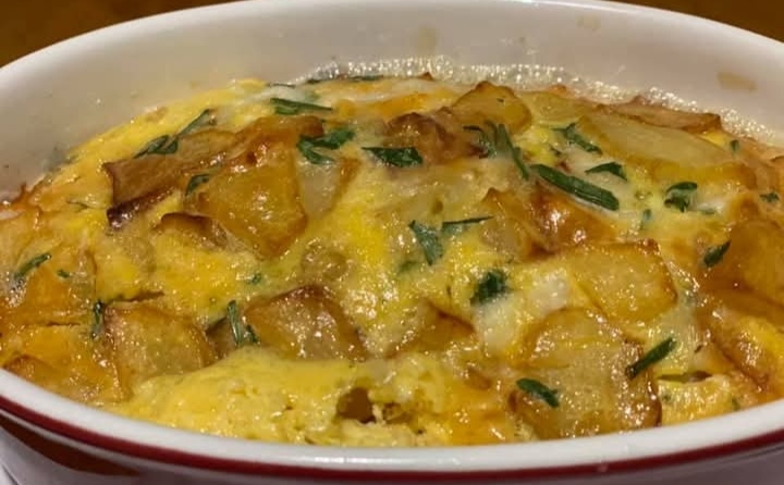 ــ نفرغ على البيض البطاطا والبصل.