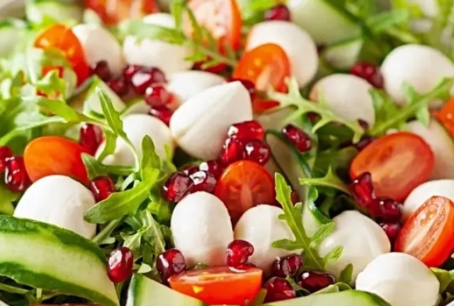 ــ سلطة الجرجير ببيض السمان وكرات جبنة الفيتا والطماطم الكرزية بالرمان جاهزة!