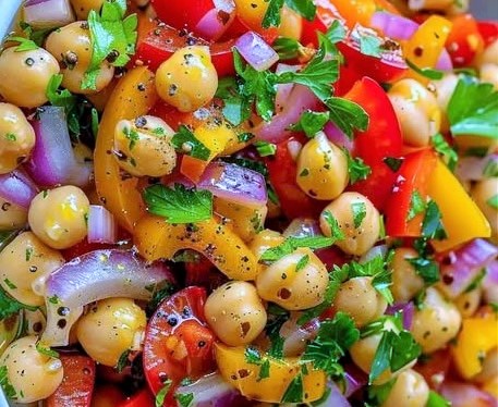 ـــ في وعاء سلطة مناسبٍ، نمزج الحمص مع الفلفل الحلو والبصل والبقدونس.