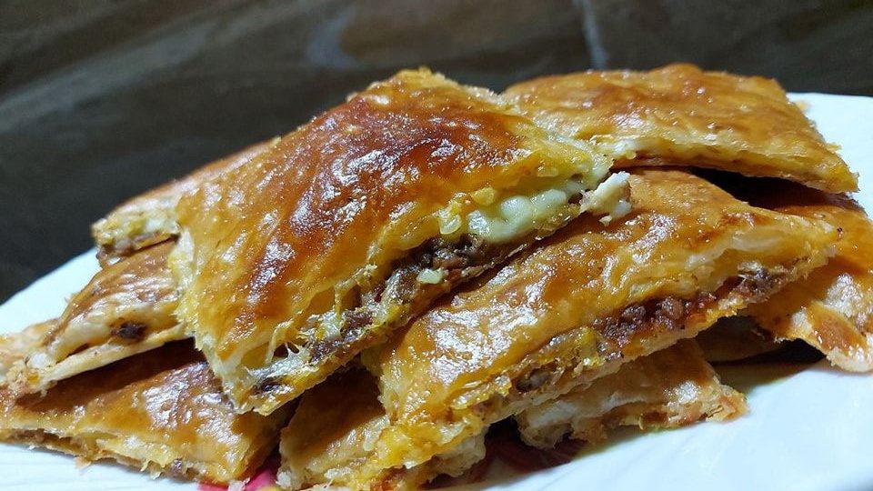 ــ القسم الأول نضعه في صينية فرن مناسبة. نضع خليط اللحم المفروم على كامل العجينة، ثم نغطيها بالقسم الثاني للعجينة.